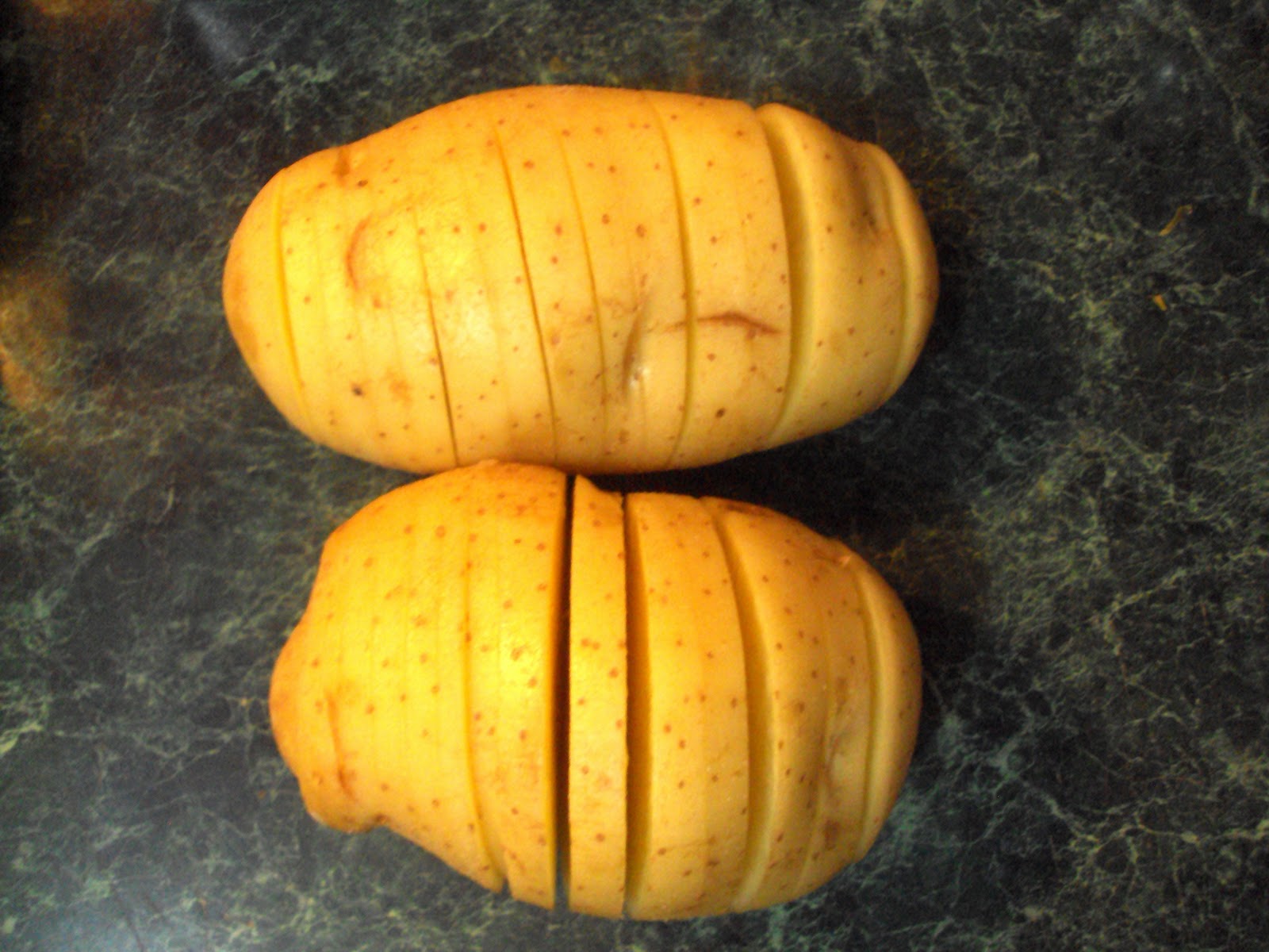 See? The potato slices should remain together at the bottom of the potato, and the wooden spoons allow you to cut the potato easily.